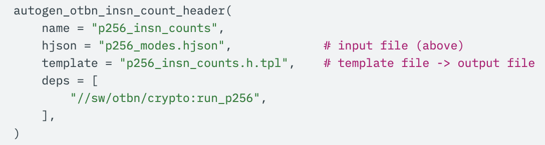 From there, a single Bazel rule results in the autogenerated C header, complete with ranges of possible instruction counts: merely adding
