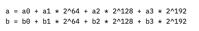 But we can do even better than that by realizing that p = 2^255 - 19 is so close to a power of two (for the mathematicians, a pseudo-Mersenne prime). Pretend we have two numbers a and b mod p, which we can split into four 64-bit chunks: